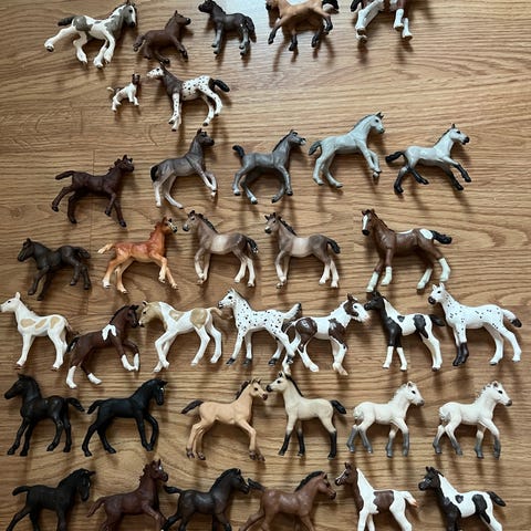 Schleich hevoset, ponit ja varsat. Vasemmalla edessä paljon Rambon tallista tuttuja ja takana poneista myös paljon.