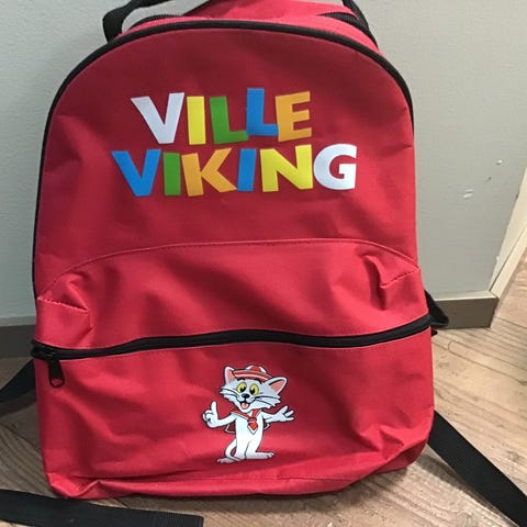Lehmä-aiheinen tarhareppu. Muuten ei kulumia, mutta ison lokeron vedin irronnut, siinä lenkki edelleen eli voi laittaa vaikka avaimenperän siihen. Muuten hyvässä kunnossa.