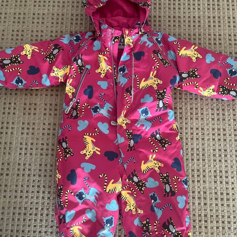 Söpö vaaleanpunainen vk-haalari (koko 80), merkki Jonathan. Ollut kolmella lapsella käytössä: pientä kulumaa / haalistumaa, mutta ei reikiä tai repeämiä. On aika napakkaa kangasta, eli saattaa ainakin hieman hylkiä kosteutta.