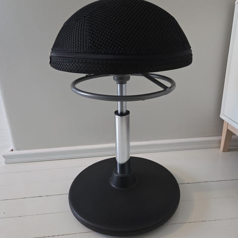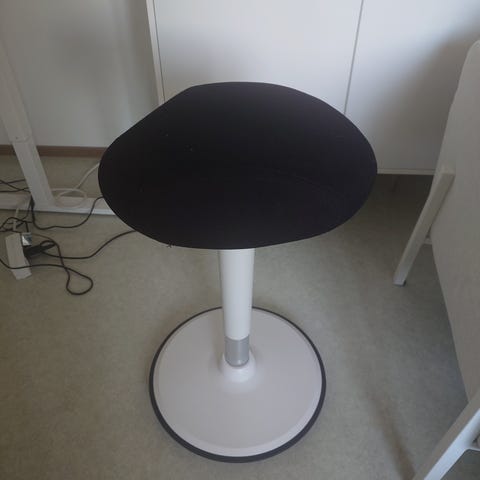 Musta aktiivituoli myyntiin. Halkaisija 34 cm istuimella, säädettävä korkeus 61-85 cm. Paino 6,6kg ja painorajoitus 125kg.