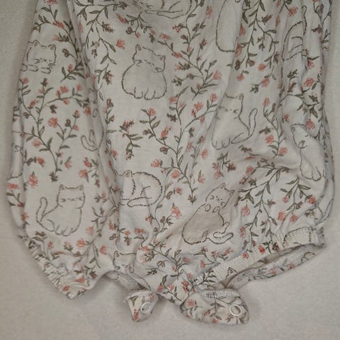 Newbie-yöpuku koossa 74. Vaalealla taustalla metsäneläimiä ja -kasveja, vihreät yksityiskohdat. Edessä nepit.