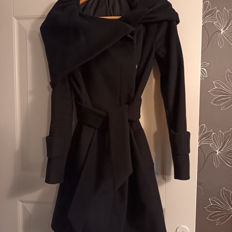 Laadukas ja persoonallinen musta villakangastakki koossa xs. Takissa on 80% villaa, joten on lämmin ja kestävä.