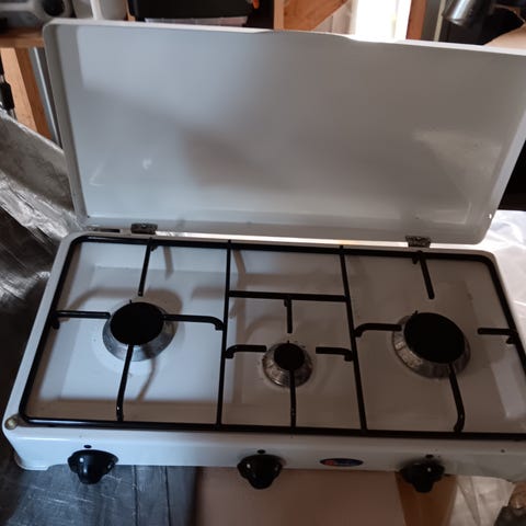 Kaasuliesi valkoisella värillä ja kompaktilla koolla. Sopii pieniin tiloihin ja tarjoaa perustoiminnot ruoanlaittoon kaasulla.