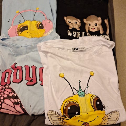 Lyhyitä erivärisiä t-paitoja. -Kokomerkinnät xxs-xs-s, melko samankokoisia kuitenkin. Hyvin lyhyitä xs kokoiselle, sopinee paremmin nuorelle.
