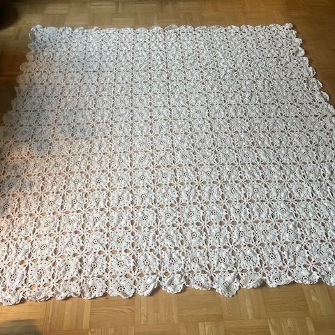 Kaunis päiväpeitto, viltti ym. Hieman nukkaa, muuten kunto erinomainen.