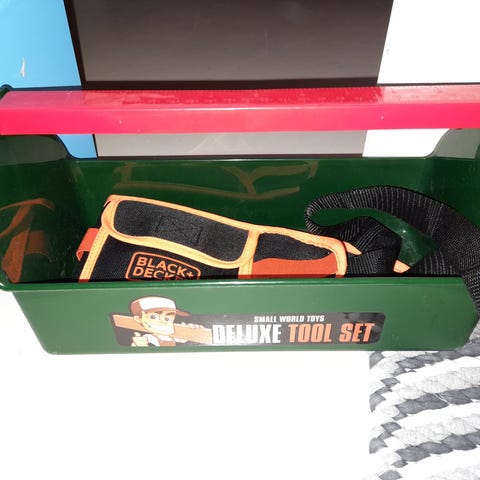 Lasten työkalupakki ja työkaluvyö, joihin saa laitettua leikkityökalut. Kaupan päälle leikkimoottorisaha ja kulmahiomakone, joissa ei toimi äänet tms. Nouto Pirkkalasta.