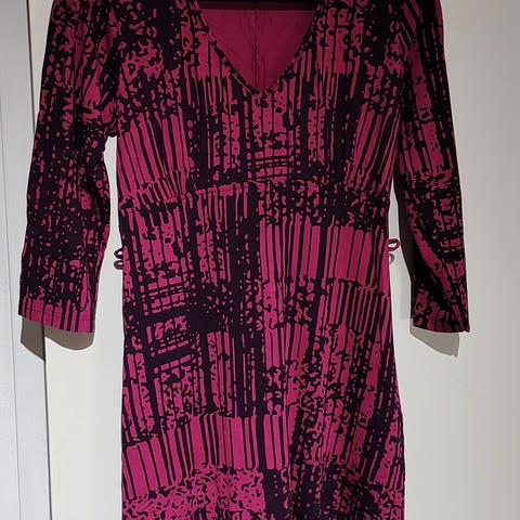 Käytetty mutta hyvässä kunnossa Nanso mekko.Paksu trikko ,sivussa taskut . Vaikka S koko mutta reilu .Koko,kai -kai noin 51 cm.Pituus noin 89 cm.