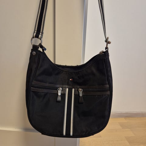 Tommy Hilfiger olkalaukku jossa yksi vetoketjullinen tasku. Laukku muutoin hyvässä kunnossa mutta kulumaa sisällä yhdessä seinämässä.
