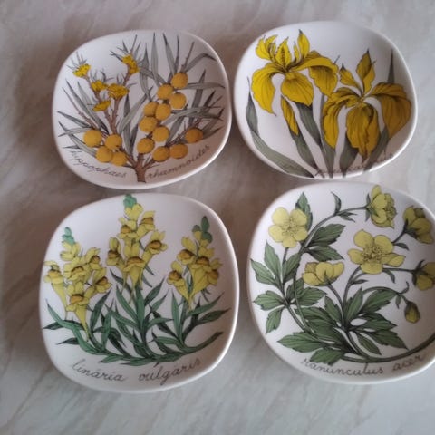 Suo-orvokki, rentukka ja ketunleipä. Kaikki ovat ehjät ja hyväkuntoiset. Eri kieliset nimet ovat jokaisen takana.