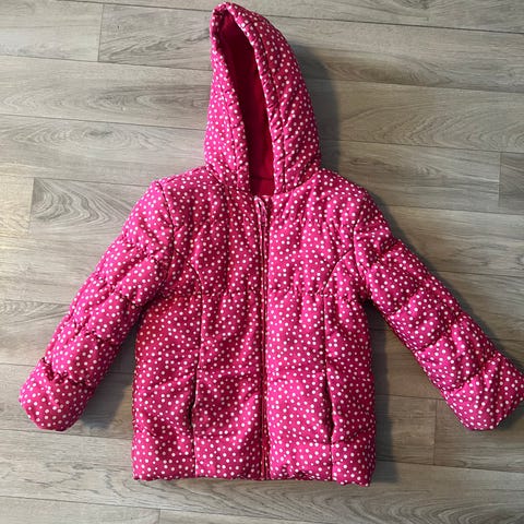 Punainen takki koossa 104cm. Käytön jälkeä on, mutta yleisilme on siisti.irrotettava huppuja vetoketjukiinnitys.