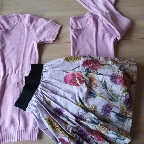 Myydään erinomaisessa kunnossa olevat sifonkihame ja neuletakki koossa 128cm. Tanskalainen merkki Noa Noa.