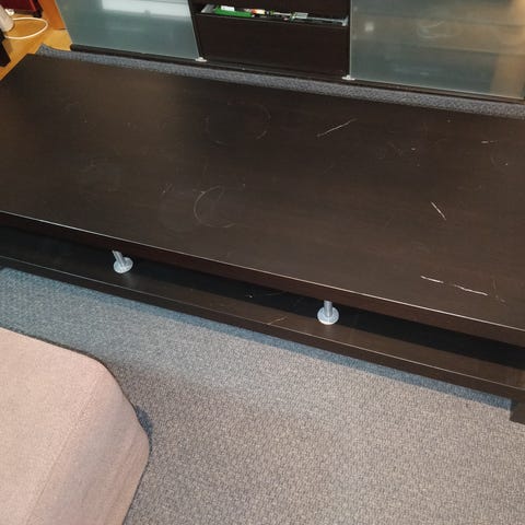 Pinnoilla hieman likaa, melko reilusti naarmuja. Kulmasta hieman repsottaa, jaloista pinta kuoriutuu. Toisella sivulla teipistä jäänyt liimat. Mitat eivät ole täysin tarkkoja.