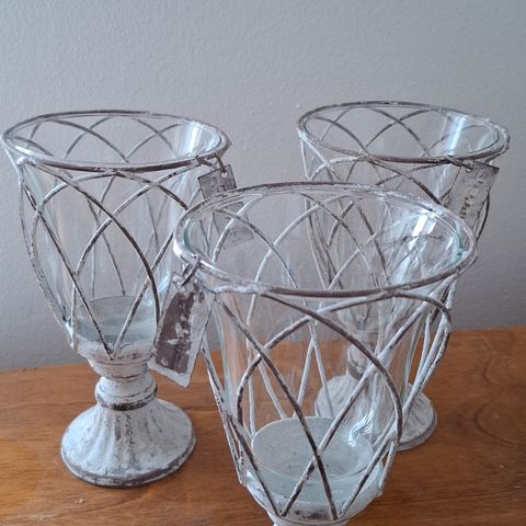 Finnmarin viisi kaunista lasista kynttilänjalkaa joko peruskynttilälle tai leveälle pöytäkynttilälle. Korkeudet noin 18.5 cm 8 cm ja 13 cm