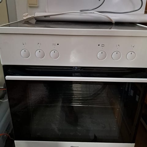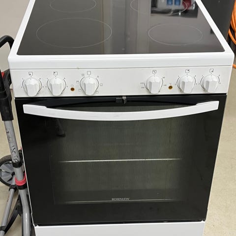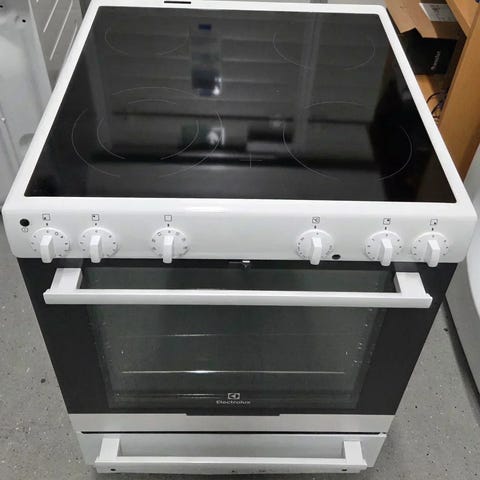 Electrolux liesi, jossa valkoinen runko ja keraaminen keittotaso. Liesi sisältää uunin, jossa lasiovi ja säätönupit. Soveltuu kotitalouskäyttöön. keittotaso ja kiertoilmauuni, leveys 60 cm