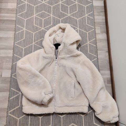 Kaunis luonnonvalkoinen "pörrötakki" kokoa 50/52. Cellbesin mallistoa. Edessä kaksi vetoketjullista taskua. Ollut muutamia kertoja päällä. Pesty hajusteettomalla. Mitat, kai-kai n. 67cm ja pituus n. 83cm.