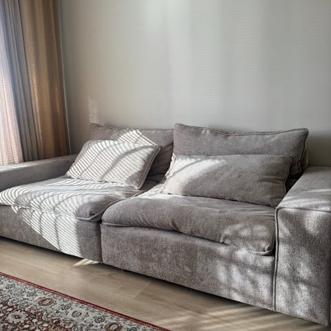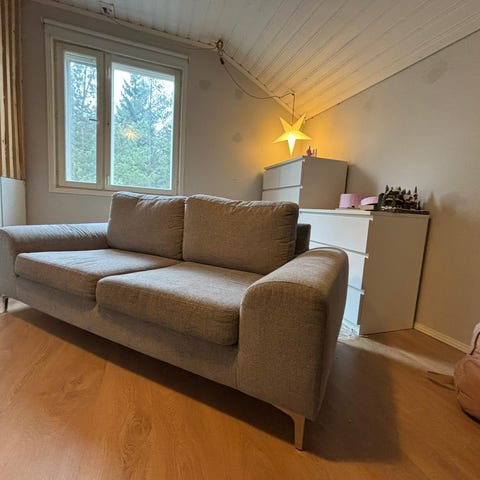 Myynnissä upea, laadukas ja mukava sohva. 🤍 Tilava ja tässä on todella hyvä myös nukkua! Istumasyvyys 65 cm.