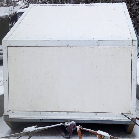 Kylmäkontti jostain 90'luvulta. Kontti joutsassa, kälä myydään sisältöineen.