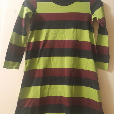 Hakusanat: tyttöjen, tytölle, mekko, trikoo, trikoomekko, raitamekko, raidallinen, punainen, 116, 120, 122, tunika