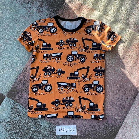 Laadukkaasta Paapiin työkonetrikoosta siististi omalle lapselle ommeltu T-paita. Vastaa kokoa 128/134. Siistissä käytetyssä kunnossa.