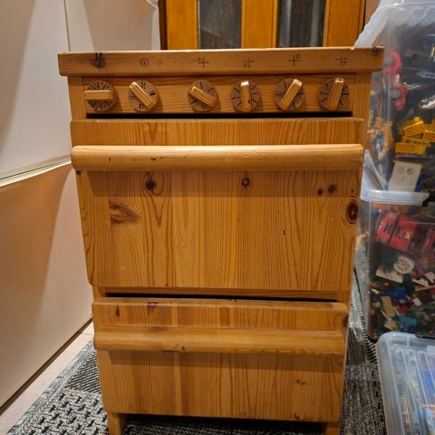 Siistikuntoinen Kids Concept puinen hella ja ”uunipelti”, leikeistä on tullut muutamia pieniä kolhuja. Uuninluukku aukeaa ja säätimistä voi kääntää oikean lämpötilan leikkiruuille. Nupeista kääntäessä kuuluu pieni klik-ääni.