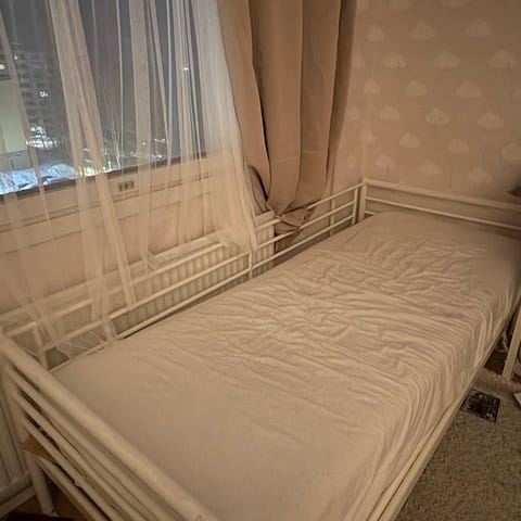 Metallinen päivävuode valkoisella pinnoitteella, koko 90x200 cm. Runkona käytetty metallia, jossa koristeelliset yksityiskohdat. Sopii makuuhuoneeseen tai vierashuoneeseen lisävuoteeksi tai oleskelupaikaksi.