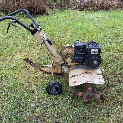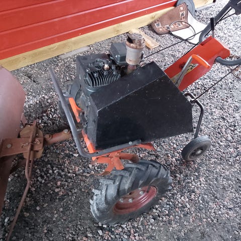 Heikosti käynnistyy, olisko vanha bensa?kauan seissy, 5 vaihetta ja pakki, veto renkaat puuttuu, harja ja jyrsinterät on. renkaat kun hankkii saa sarvitraktoriksi tai lumilingon nii onnistuu lumityöt