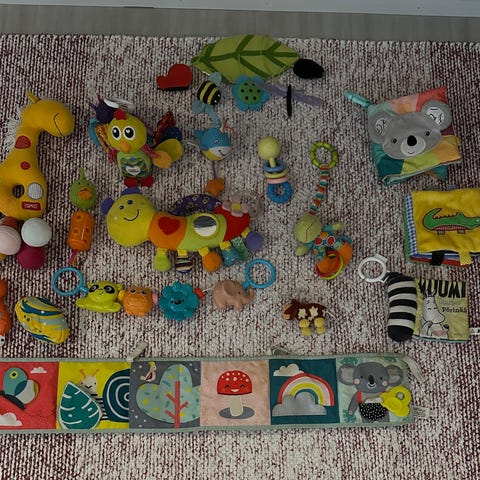 Kirjoja, leluja ja kortteja vauvalle. Tulee radio mukana.