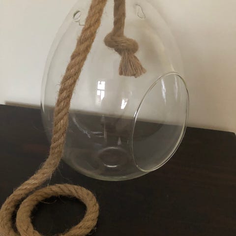 Soikea pallo, 'leikattu' tasaiseksi niin pysyy pystyssä. Ontto ja reikä pohjassa.