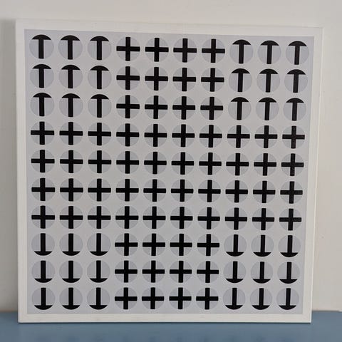 Seija Salmelan signeeraama Risti ja T niminen akryylityö pellavalle vuodelta 2017.