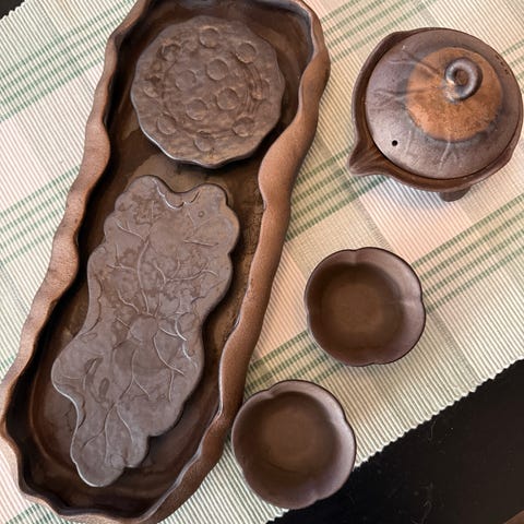Upea keramiikkainen teekannu, jossa on rottingilla varustettu kahva. Kannun pinta on karkeapintainen ja siinä on irrotettava kansi. Soveltuu teen tarjoiluun ja esillepanoon.