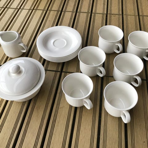 Arabia Arctica sarjan kahvikuppeja, tasseja, kermakko ja sokerikko. 1kpl kermakko, 1kpl sokerikko, 8kpl kahvikuppi ja 10kpl tassi. Parissa kupissa hyvin pientä pinttymää. Astiat tiskattu pääosin käsin.