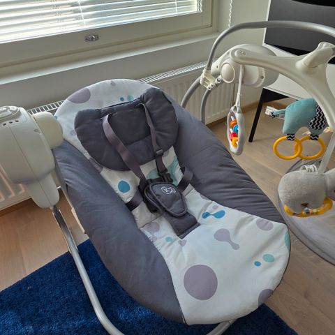 Kinderkraft-merkin sitteri. Saa keinuteltua tai laitettua tukijalat että pysyy paikoillaan. Tärinätoiminto ja musiikkitoiminto. Pohjakangas harmaa, lisäksi kuvassa näkyvä vaaleanpunainen/kukallinen kangas jonka saa taiteltua pussukaksi vauvaa lämmittämään. Turvavyöt sitterissä on. Kuvassa näkyvä lelukaari kuuluu kauppaan. Meiltä käytöstä toimivana poistunut. En postita. Nouto Orivedeltä tai kulkeutuu omien menojen mukana Tampereelle.