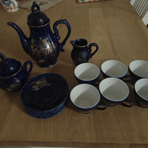 Tee kannu, sokerikko, 6 kpl tee kuppeja ja lautasia