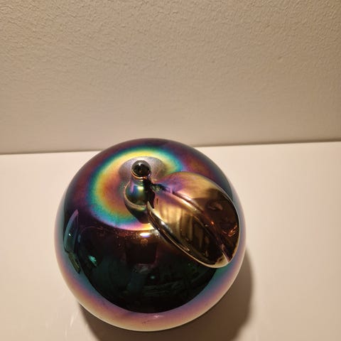 Koristeomena luonnonbeigenvärisestä onyksista, korkeus 4 cm. halkaisija 3,5 cm.