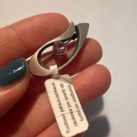 Kaunis vaaleanpunainen kristalli? Rintaneula. Hopealeima löytyy. Pituus noin 5 cm, kivi noin 3,1 cm pitkä.