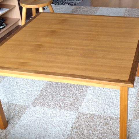 Myydään teak kantinen pöytä. Pöydässä kauniit messinkiset yksityiskohdat. Edellinen omistaja entisöinyt taidolla. Normaalia kulumaa pöydän pinnassa.