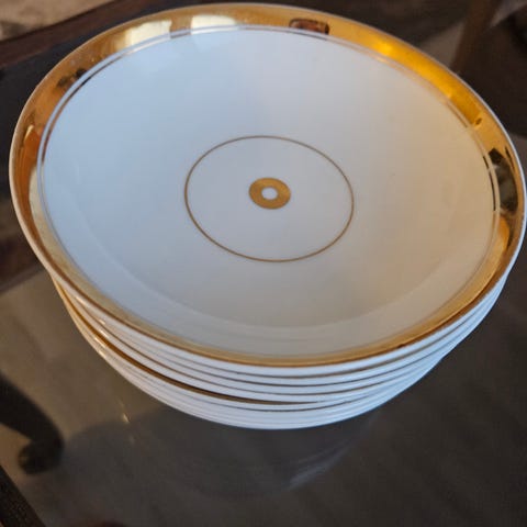 Oikein siistejä, ehjiä ja hyväkuntoisia. Kaikista kuvat sekä ylä- että alapuolelta. Jos jotain vikoja etsimällä etsii, niin pieniä "valuvikoja" eli tietynlaisia kulumia tai pisteitä, jotka jo tulleet valmistuksessa, ollen lasituksen alla. Kultauksetkin vielä eheitä. 1940-luvulta nämä. 🙂