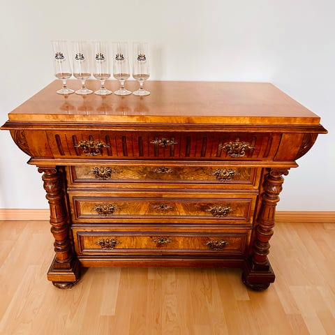 Myydään vanha ja tukeva senkki, arviolta 1940–50-luvulta. Kaunis, koristeellisin yksityiskohdin viimeistelty huonekalu, joka toimii hyvin esimerkiksi tv-tasona tai säilytyskalusteena.