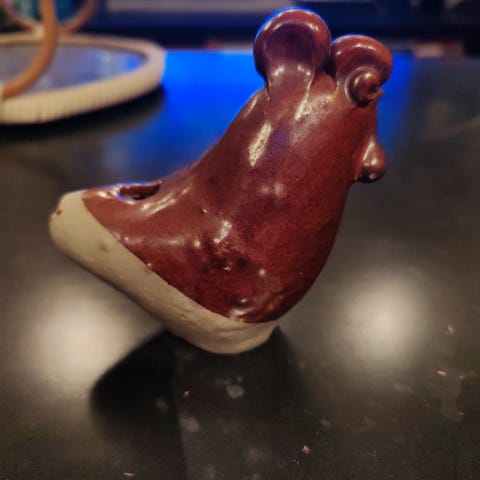Puinen käsinmaalattu kana ja puisia käsinmaalattuja munia.