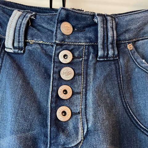 Denim shortsit naisten kokoa M, sinisen väriset. Housuissa on kulutettu ja rikottu design, joka näkyy erityisesti reisien alueella. Materiaali on farkkukangasta, ja shortsit sisältävät etu- ja takataskut. Sopivat rentoon ja arkikäyttöön.