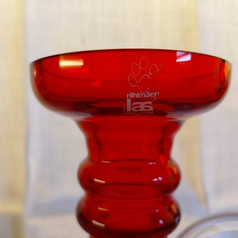 Kirkkaanpunainen Kleopatra-maljakko Riihimäen Lasilta, korkeus 20 cm. Tamara Aladinin suunnittelema Kleopatra-sarja on ollut tuotannossa vuosina 1970-1976. Maljakko on yleisilmeeltään siisti ja hyväkuntoinen.