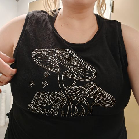 Harmaa, kestävä ja kiva toppi, jossa 1 koristeellinen metalli olkain.