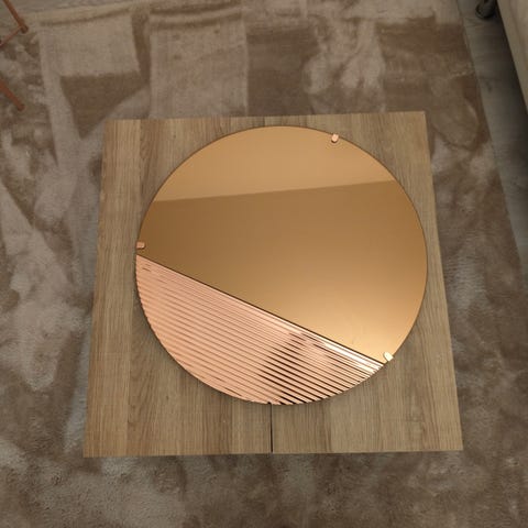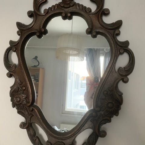 L30 X K46 cm, ketju 41 cm. Pisaranmallinen peili jämäkässä pinkiksi maalatussa metallikehyksessä.