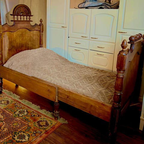 Antiikkinen, kunnostettu, kangas puhdas pellavaa, runkopatja poistettu, sängyn pohja rakennettu uudelleen. Myydään ilman patjoja.