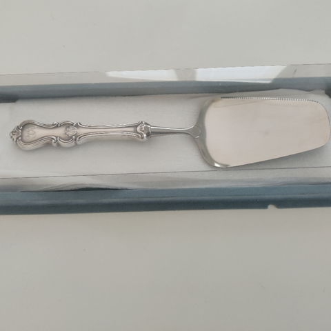 Kultakeskuksen kakkulapion kahva on valmistettu 83 % hopeasta ja terä ruostumattomasta teräksestä.