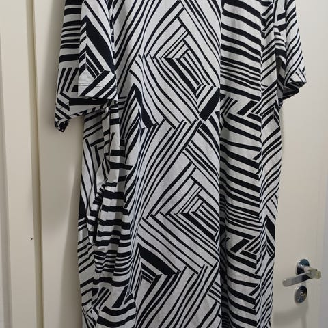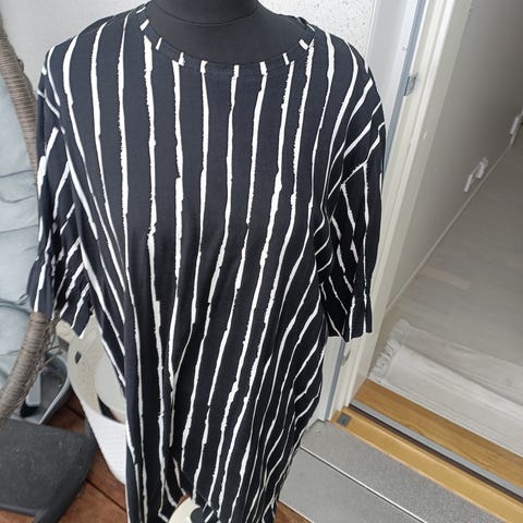 Myydään Marimekon Kioski-sarjan Ilma-mekko musta-valkoisella tasaraitakuviolla. Trikookangasta. Ei taskuja. Vasemmalla alareunassa halkio. Mukana samankuosinen vyö. Lievä A-linja.