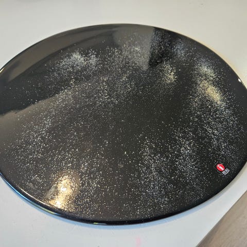 Nuutajärvi Oiva Toikka Pioni iso lasitarjoilulautanen kirkkaasta lasista, jossa koristeellinen kuviollinen pinta. Lautanen on suunniteltu Oiva Toikan toimesta ja siinä on yksityiskohtainen koristekuvio, joka esittää hedelmiä ja kasveja. Lautanen soveltuu tarjoiluun tai koristekäyttöön. Alkuperäisessä pahvilaatikossa.