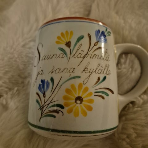 Myydään Arabian vanhoja saunamukeja 6 kpl. Mukit ovat ehyitä, käsinmaalattuja ja jokaisessa on teksti edessä ja kuva takana. Mielellään yhdessä, mutta voin myydä erikseenkin. Hinta 30€/ kpl. Nouto Kokkola/ Pietarsaari tai postitus ostajan laskuun.