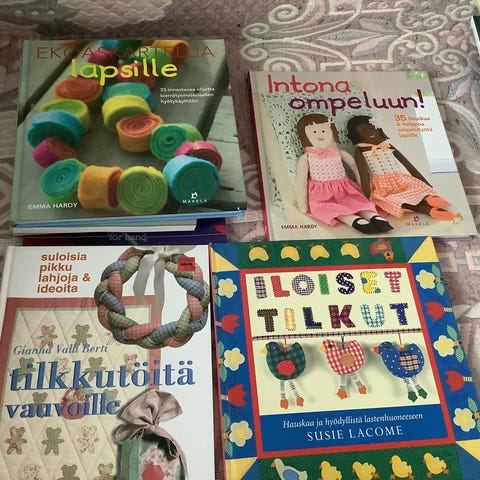 Kuvan ompelutyöt lapselle , toinen muumiaiheilla ja mukaan osin käytetyt langat ja toinen Djecon kovalla pahvilla olevat 3 kuvaa omassa laatikossa. Siihenkin mukaan jäljellä olevat langat ja neulat. Lisäksi mukaan erä ompelutyökortteja.