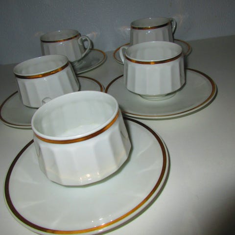 vintage Arabia pieni kuppi, kuppi sisältä kullattu ja asetti kullattu, kahva kullattu. Kotimaan ja vientituotteiden Kruunu leima vv. 1964 – 1971. 6 kpl , uudenveroisia, ilmoituksessa kappalehinta, nouto, postitus
